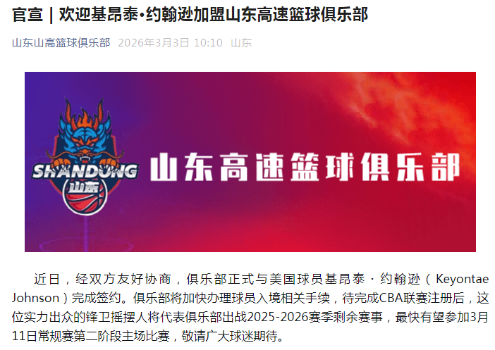 山东男篮官方公告写道:“经双方友好协商,俱乐部正式与美国球员基昂泰-约翰逊完成签约。俱乐部将加快办理球员入境相关手续,待完成CBA联赛注册后,这位实力出众的锋卫摇摆人将代表俱乐部出战2025-2026赛季剩余赛事,最快有望参加3月11日常规赛第二阶段主场比赛,敬请广大球迷期待。”